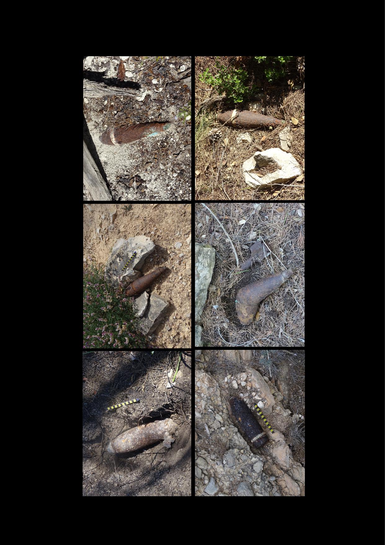 De vegades no cal excavar per trobar restes materials d’aquell conflicte, només seguint les línies de front n’ensopegués en superfície, entre aquestes restes trobo els projectils que encara són actius, amb la seva càrrega interior intacta, en ocasions amb l’espoleta de detonació present al capsal.